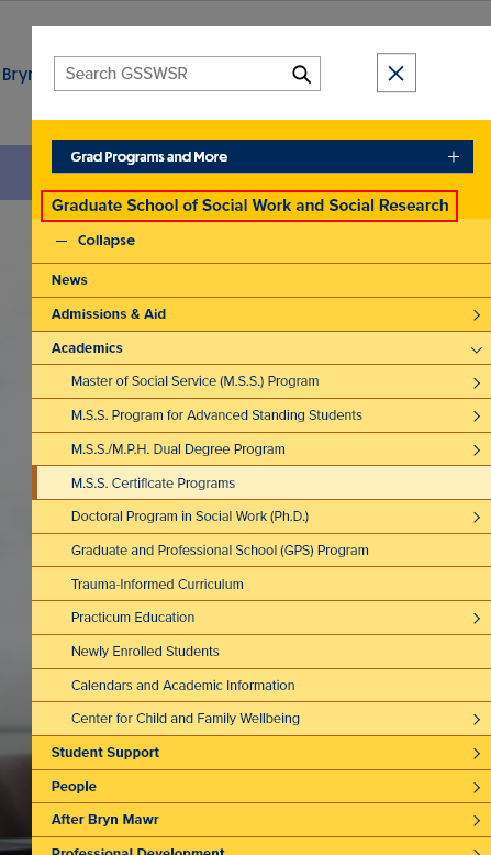 By changing to a different area, you will see that the choices in the yellow menu change to match the navigation of that part of the site. The area whose menu you are viewing is shown just below the Grad Programs and More area. Here you can see we are in the Graduate School of Social Work and Social Research area of the site. Further, you can see that we are on the M.S.S. Certificate Programs page because the menu item is highlighted with a lighter color and a bronze left-border.