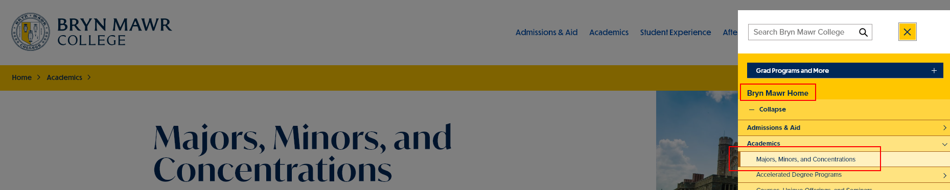 If you opened the main menu while on the page in the example above, you would see it tell you where you are. Here you can see that the expanded menu says you are in the Bryn Mawr Home site, and you are on the Major, Minor and Concentrations page because that menu item is lighter in color and has a bronze vertical left-border to it.