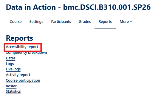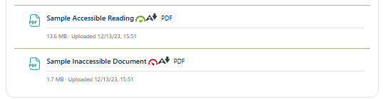 The Accessibility score icon next to each uploaded file indicates how well it meets accessibility standards. (These scores are only visible to participants with a teaching role; Auditors and Registered students cannot see them.)