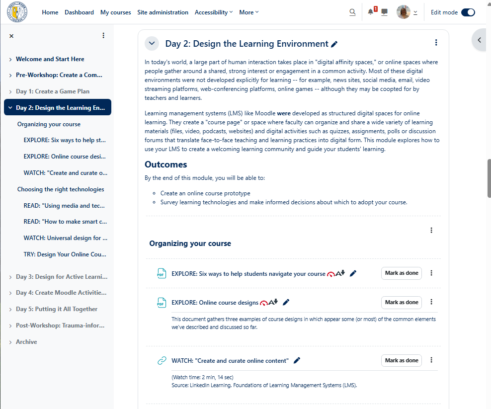 - Indent activities and resources to create visual hierarchy. With Edit mode toggled on, click and choose Move right or Move left.